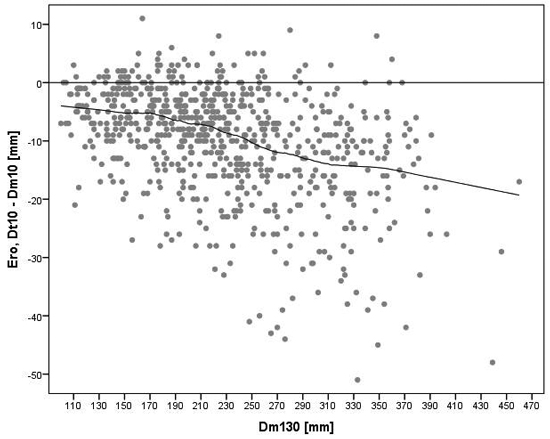Muuttujalle ∆De–t130 laadittiin lineaarinen regressiomalli, jonka selittäjänä oli De130 -läpimitta. Lopulliset tyvifunktion syöttöarvoina käytettävät D130 -arvot muodostettiin vähentämällä De130 -arvoista regressiomallin tuottamat arvot kaavan 6 mukaisesti. Regressiomallin käyttö ei ollut välttämätöntä, sillä ero kaavalla 5 määritettyyn korjauksen tasoon oli pieni. Regressiomallin käyttö kuitenkin pienensi De130 -arvojen satunnaisvaihtelua. Korjauksen (kaava 6) vaikutus oli läpimitalla (De130) 100 millimetriä –0,78 millimetriä ja läpimitalla 400 millimetriä –2,45 millimetriä.